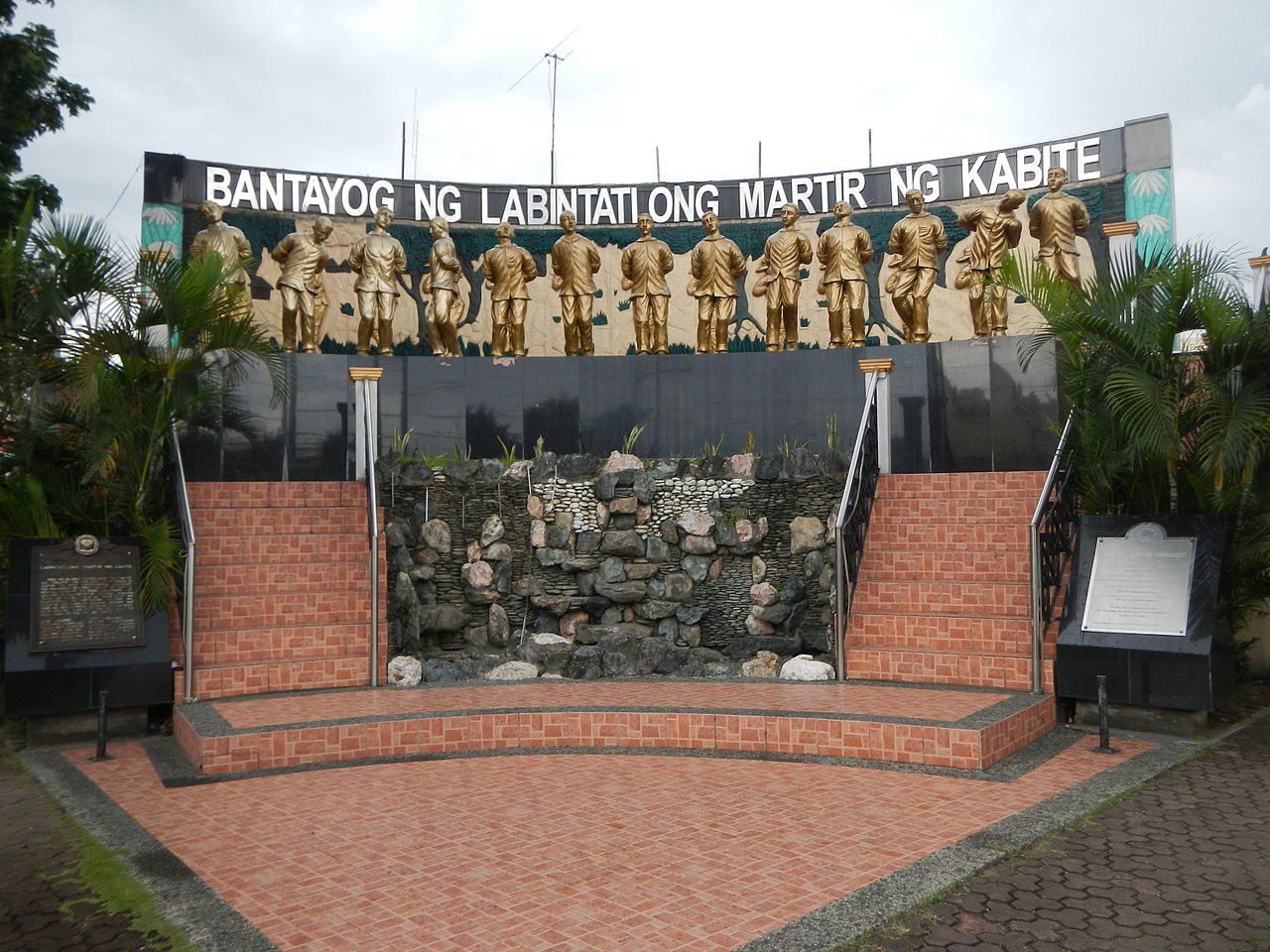 In 1906, a monument to the Thirteen Martyrs was erected in the San Roque district of Cavite City, at the head of the San Roque causeway. Their families reinterred the remains of their loved ones at the foot of the monument. The monument is located at the intersection of M. Valentin St., Lopez Jaena Rd, Zulueta Rd, and P. Burgos Ave.